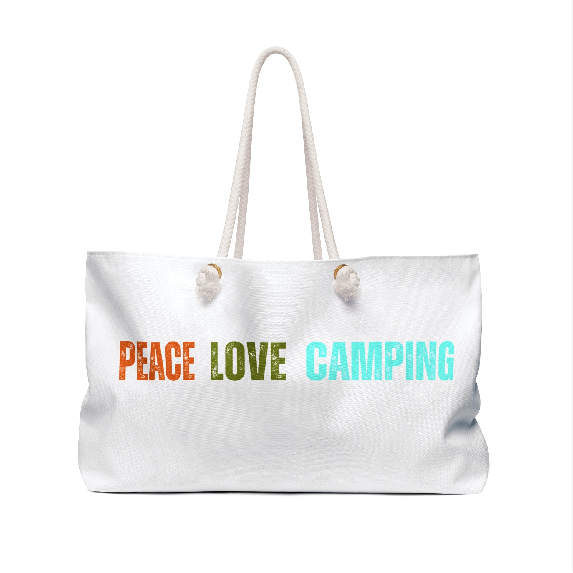 Pack your passions wherever you go with our Peace • Love • Camping Weekender Bag. Whether it’s a spontaneous road trip, a weekend in the city, or a beach escape, this oversized tote is ready to carry it all—stylishly and effortlessly.