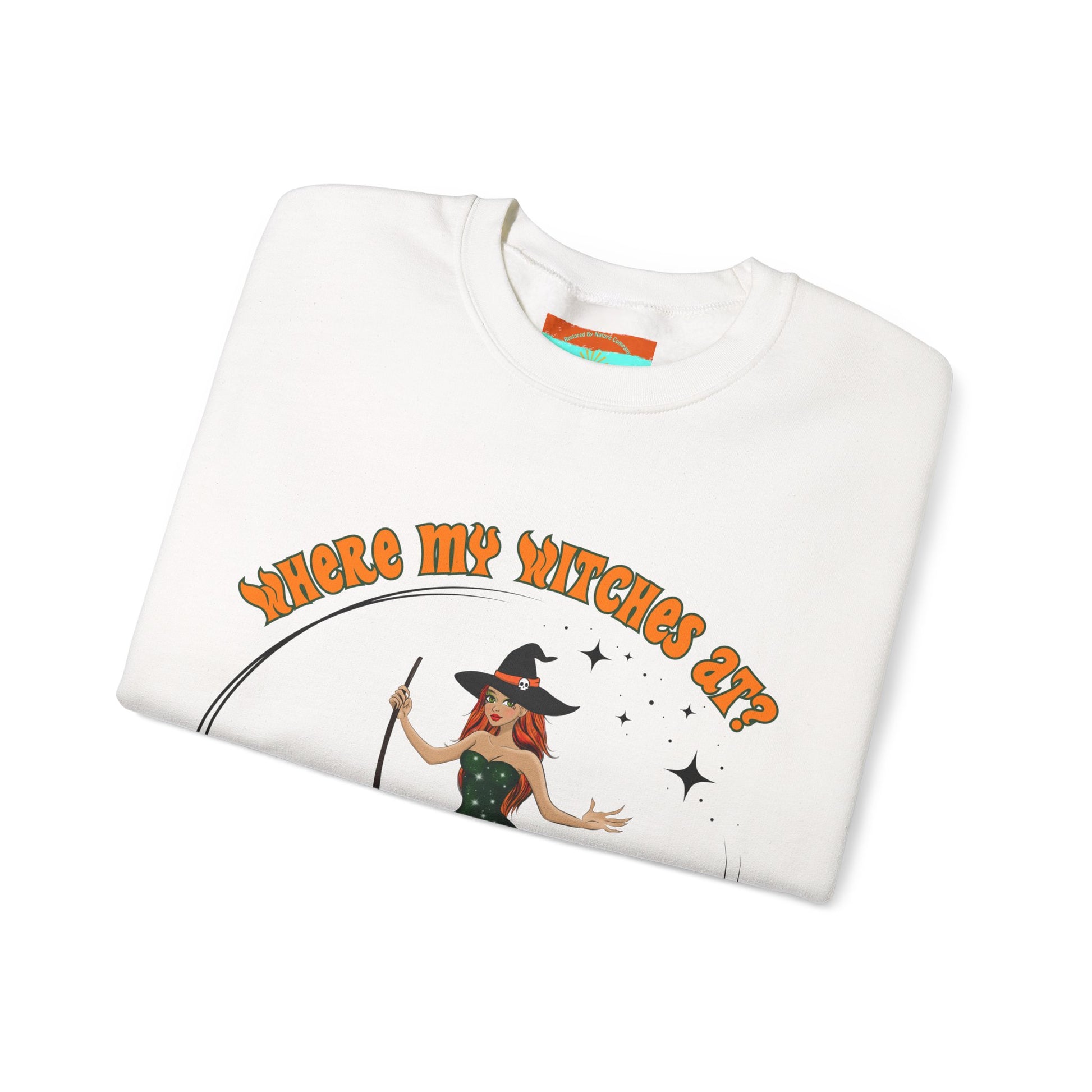 Unleash your inner sorceress with our Where My Witches At? Unisex Heavy Blend™ Crewneck Sweatshirt. This fun and sassy design is perfect for witches who love to keep it stylish and cozy during the Halloween season. Whether you're gathering your coven or just enjoying a spooky night in, this sweatshirt has got you covered. With a soft, comfortable fit and a bold statement, it's the ultimate addition to your fall wardrobe.